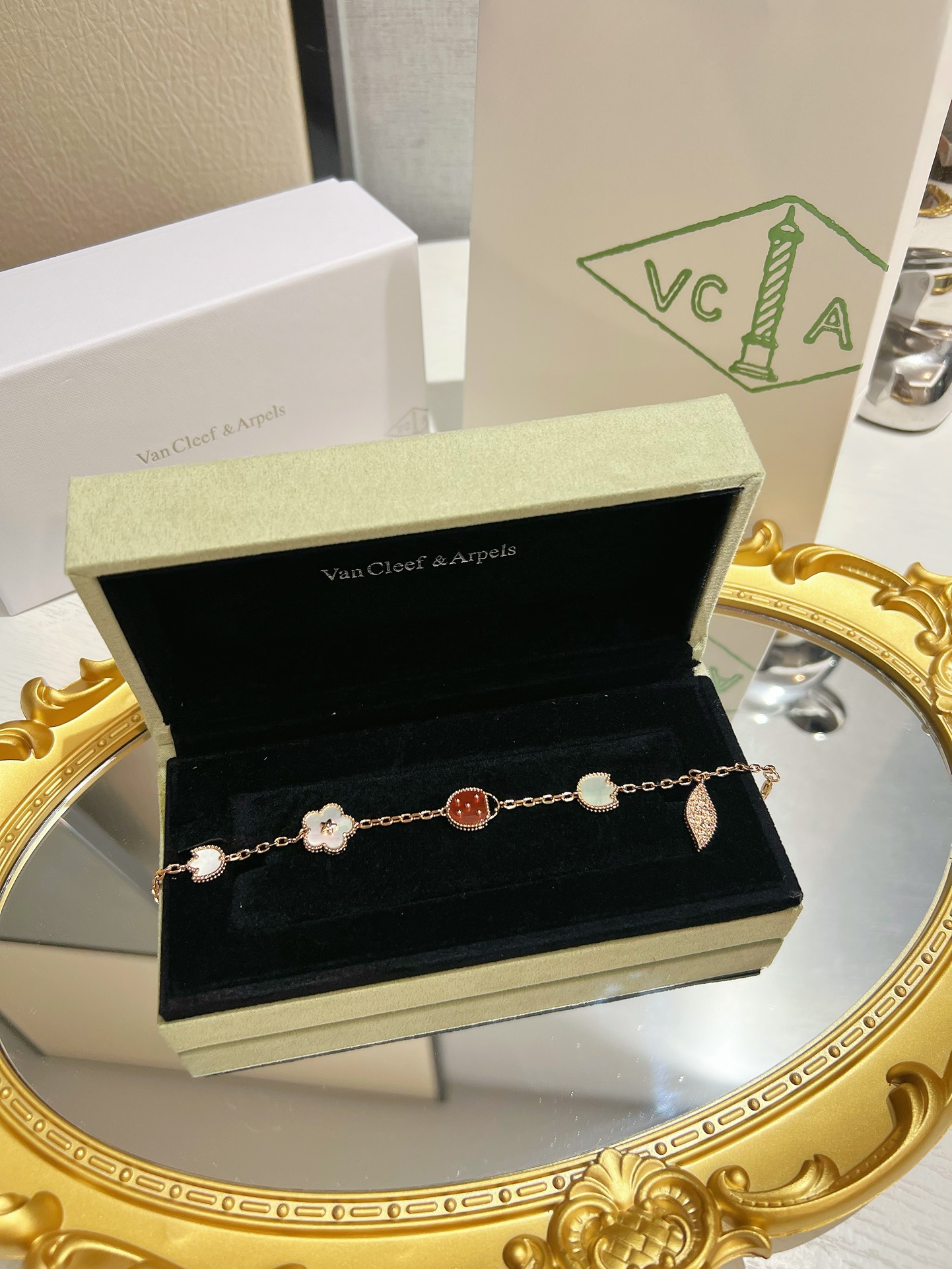 This jewelry is AAAAA 1:1 quality (superb). Materials used are identical to the original ones. Van Cleef & Arpels trademark marks are indistinguishable to the authentic. Photos take by actual jewelry, what you receive will be 100% same with our photos.