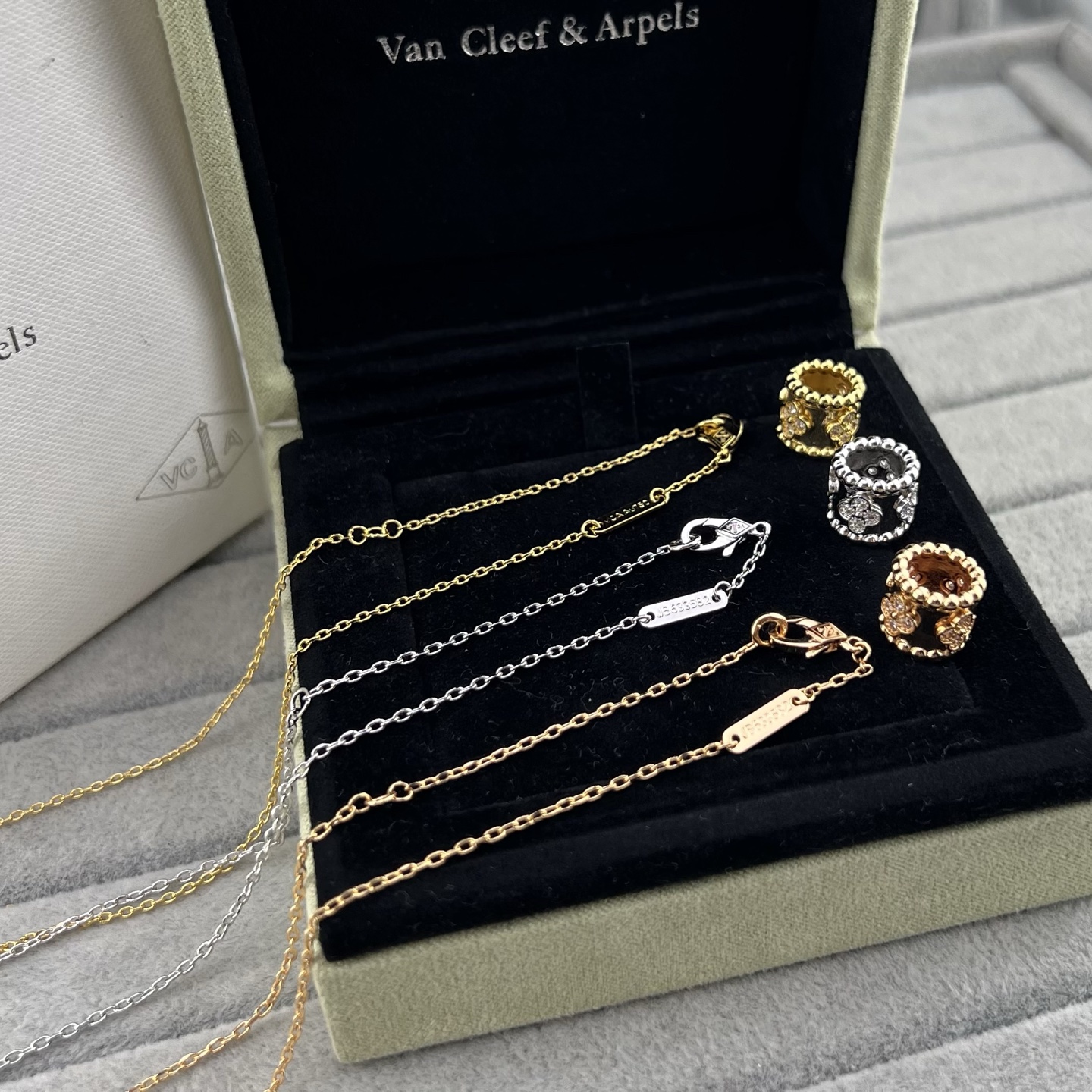 This jewelry is AAAAA 1:1 quality (superb). Materials used are identical to the original ones. Van Cleef & Arpels trademark marks are indistinguishable to the authentic. Photos take by actual jewelry, what you receive will be 100% same with our photos.