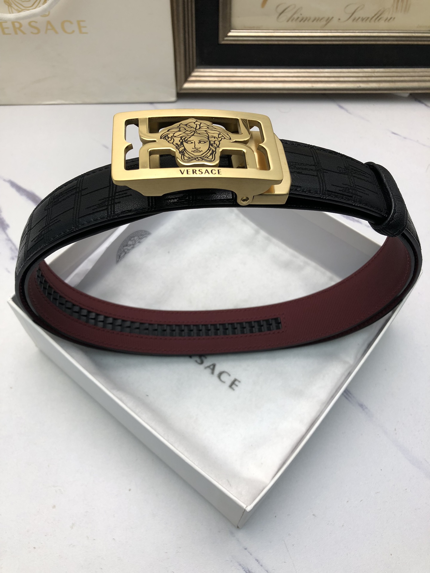 This belt is AAAAA 1:1 quality (superb). Materials used are identical to the original ones. Versace trademark marks are indistinguishable to the authentic. Photos take by actual belt, what you receive will be 100% same with our photos.